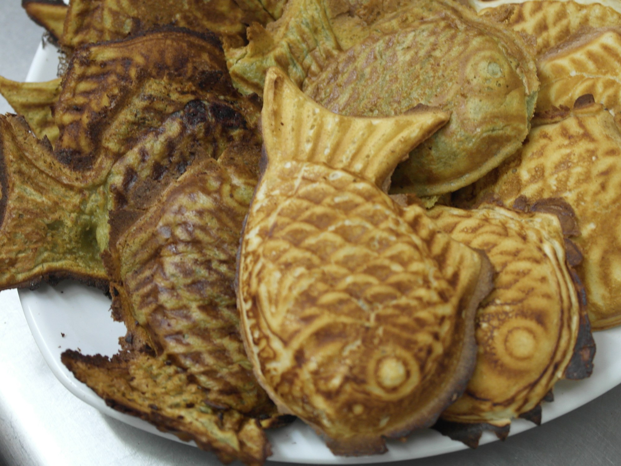 Taiyaki is a street food sold in Japan and Korea. It’s a light cake grilled in a cast iron mold filled with sweet red bean paste. My father and I decided to test out a couple of different recipes. One is a Korean version that was printed on the box of the pan and the other was off the Internet. The box recipe was more traditional crisp and the one off the Internet was more spongy and cake like. I added Macha to the Internet recipe for fun.