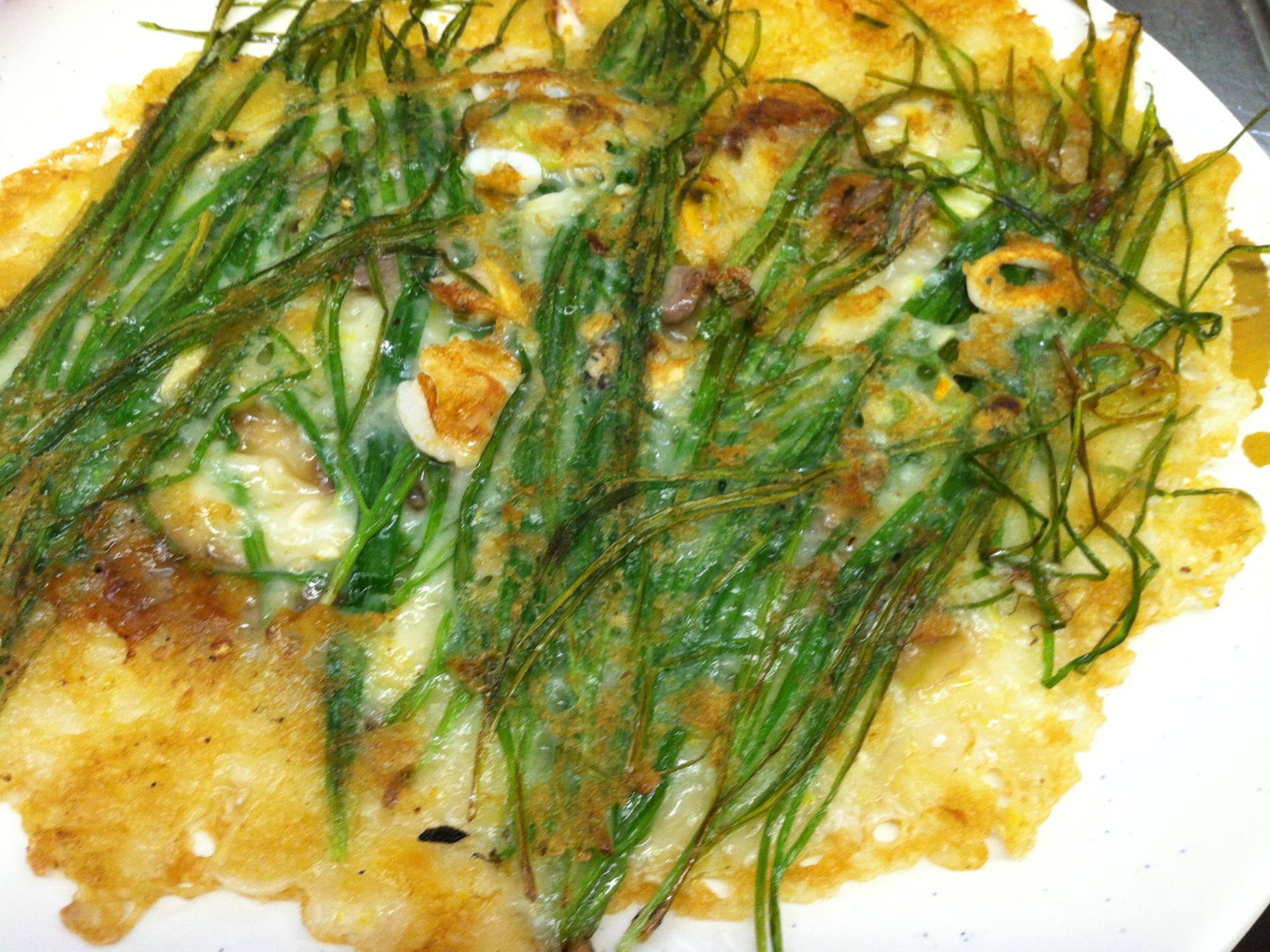 Savory pancakes are a staple in Korean meals. These are made with chives and seafood. You can add anything from kimchi to any kind of meat (wouldn’t do chicken or uncooked pork). I usually like to make everything from scratch but in this case it’s easier to just by the store mix flour.