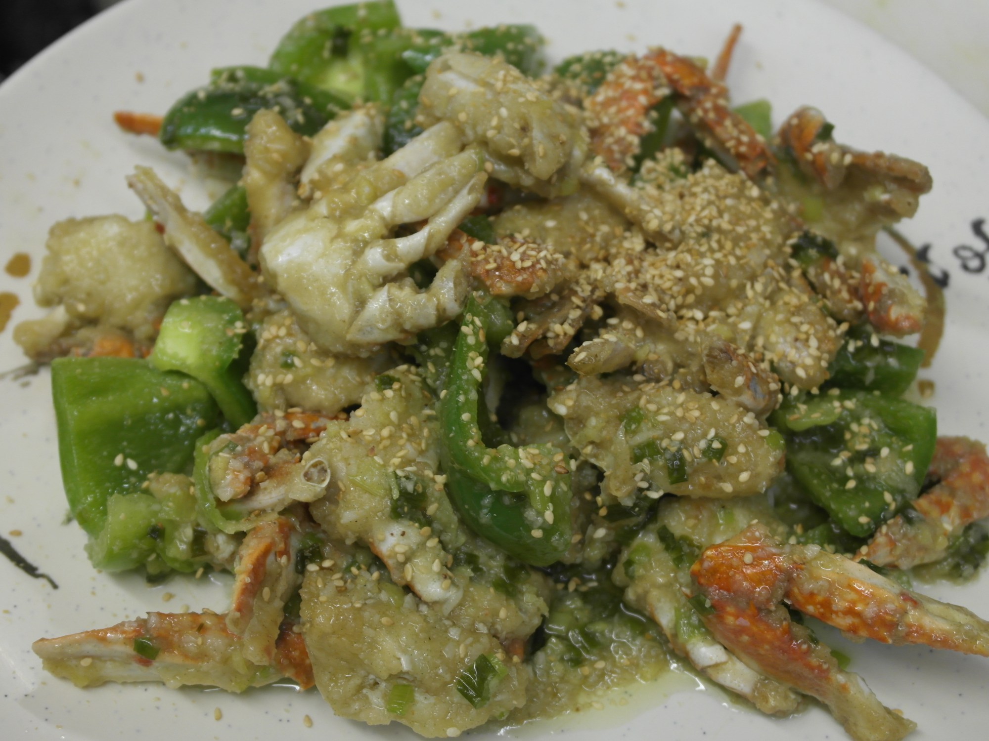 Section the crab and cut the tips of all the legs.Chop a bell pepper, 2 Tbsp garlic, 2 Tbsp Ginger and 1 green onion.Corn starch or tempura.Fry 2-3 minutes depending on the size of the crab.Allow oil to drain.Oil wok and when the temperature is high, add green onions.Saute and add 1 Tbsp water. Remove from pan and set aside.Heat 2 Tbsp oil and once hot, add garlic, ginger and green onion.Add 3 Tbsp of Sherry, 3 Tbsp Sugar and 3 Tbsp Mirin.Add 1 cup of chicken broth and sea salt to taste.Bring sauce to boil and add crab. Reduce sauce by half. Add bell peppers and toss several times and remove from pan.Plate and finish with sesame seeds.
