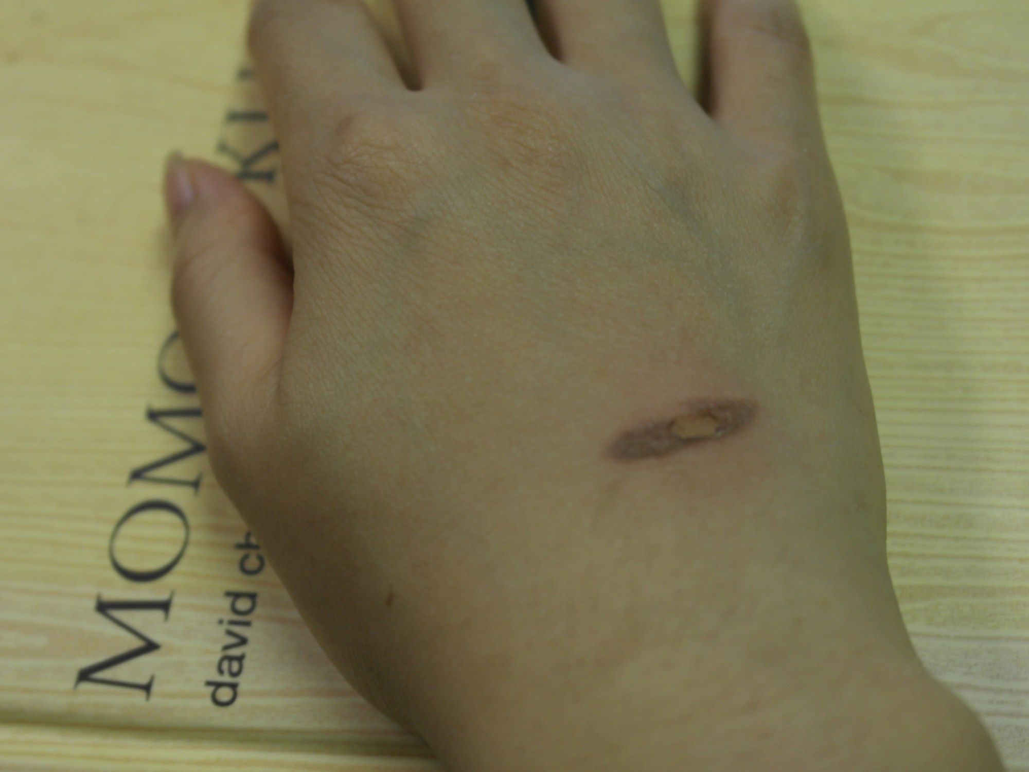 Dumped soy sauce and after about an hour a nice scab formed.  No blistering and today it looks a lot better considering how bad it had been.  There ends my dreams of being a hand model.  I wonder if it’s unattractive seeing a girl cover with battle scars from the kitchen.