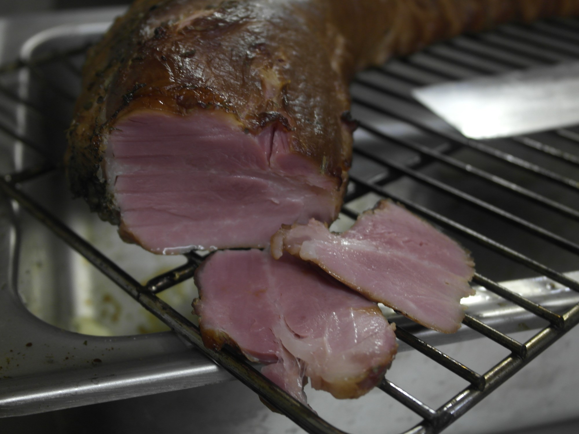 After 72 hour bath, remove from brine and rinse.  Pat dry and refrigerate for 24 hours uncovered.  Smoke @ 190F for 2 1/2 hour or till internal temperature reads 150 F.  Rest meat for at least 20-30 minutes.