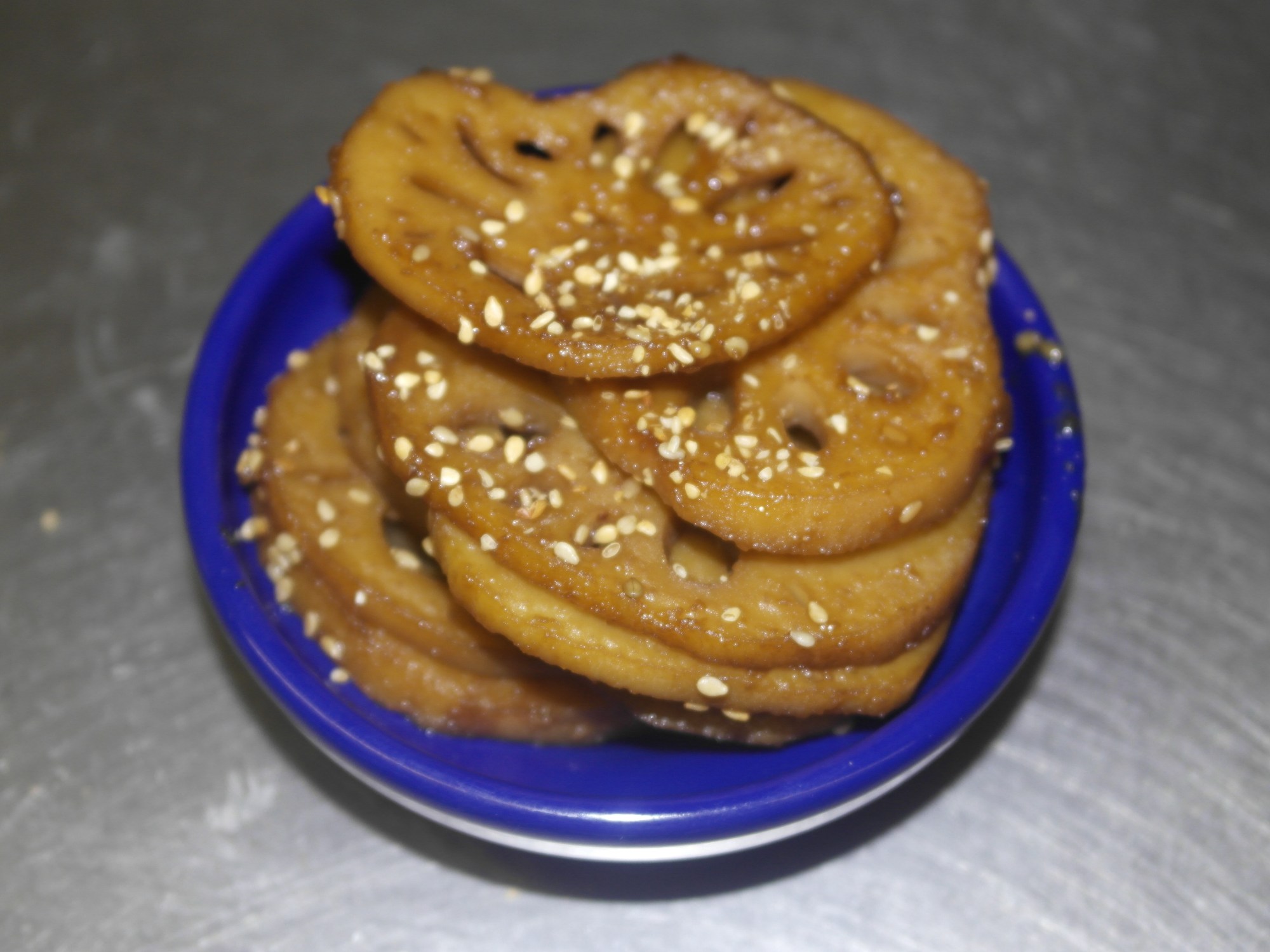 Humans must have really been hungry to start eating these roots.  I mean they’re not exactly the most attractive plant and unless properly prepared taste horrible. 300 gm Lotus Root, 2 Tbsp Vinegar, 1/2 cup Sake, 1 cup Soy Sauce, 2 Tbsp Hondashi, 3 Tbsp Corn Syrup, and 3 Tbsp Sesame Seeds.